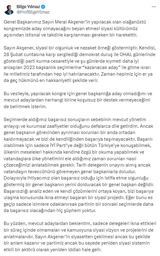 Bilge Yılmaz sosyal medya hesabından yaptığı açıklamada, “Genel Başkanımız Sayın Meral Akşener’in yapılacak olan olağanüstü kongremizde aday olmayacağını beyan etmesi siyasi kültürümüz açısından istisnai ve takdirle karşılanması gereken bir harekettir. Sayın Akşener, siyasi bir olgunluk ve nezaket örneği göstermiştir.